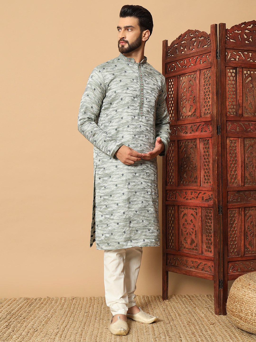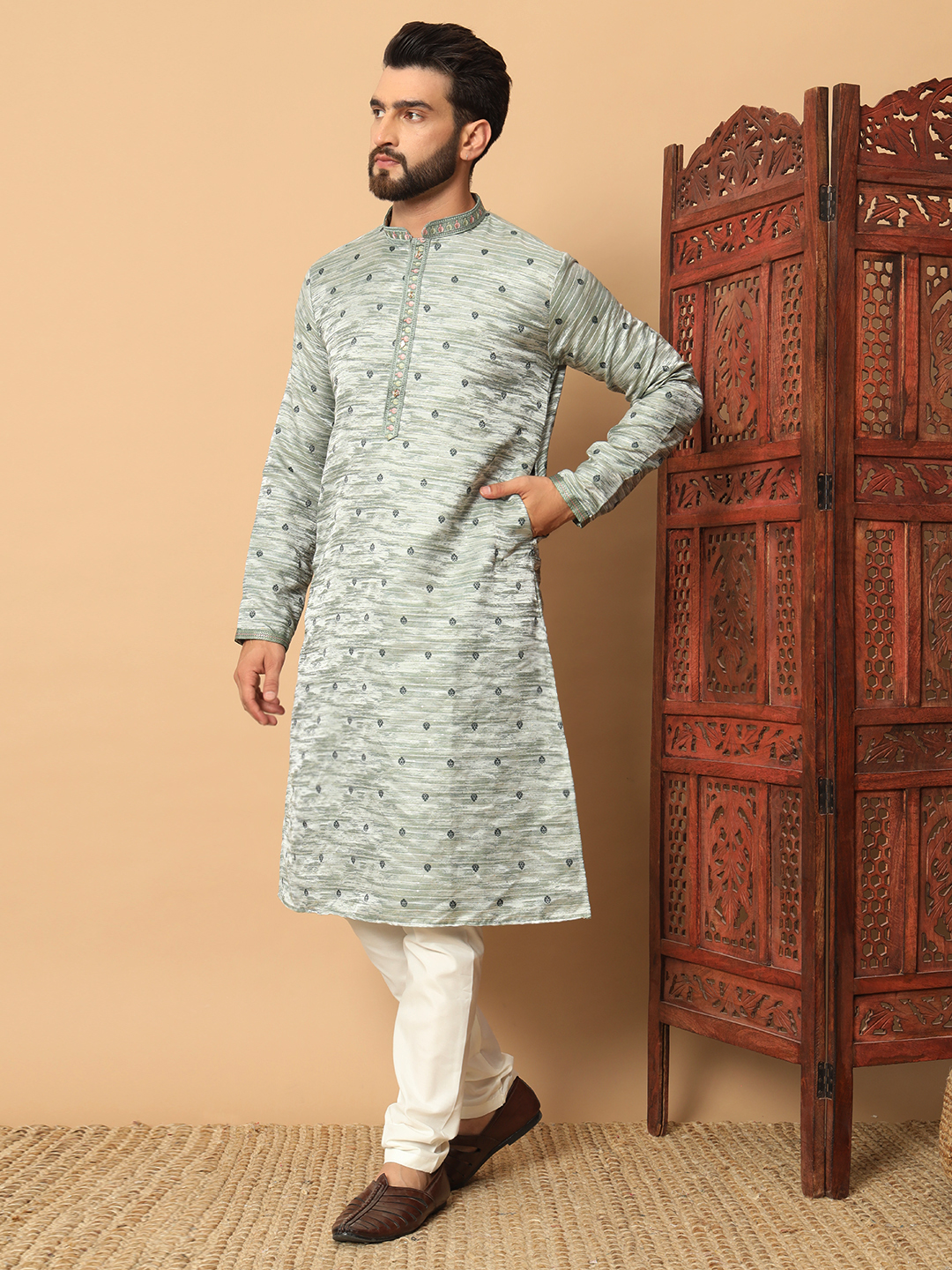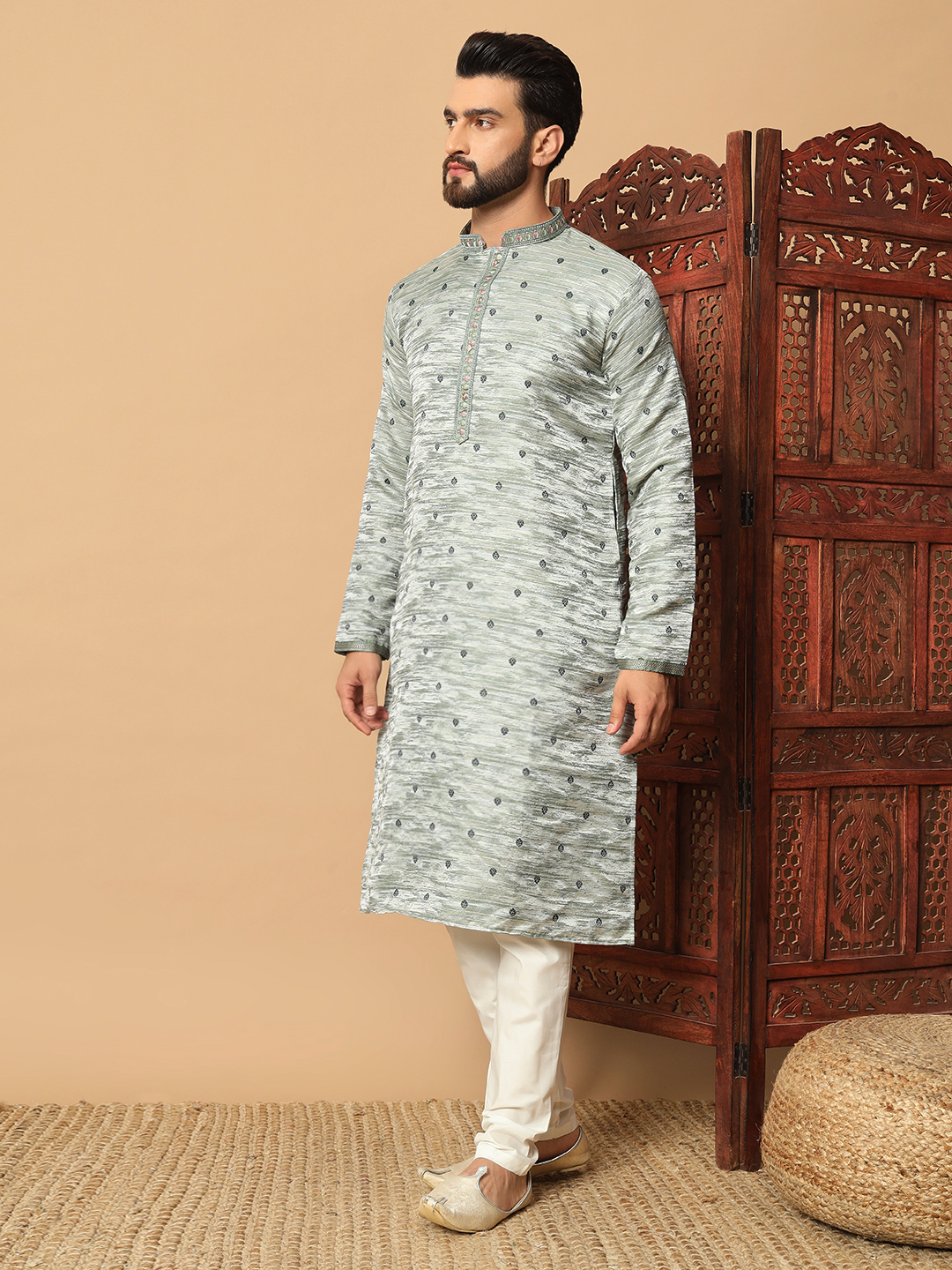Men’s Ash Green Jacquard Kurta – Premium festive and wedding wear