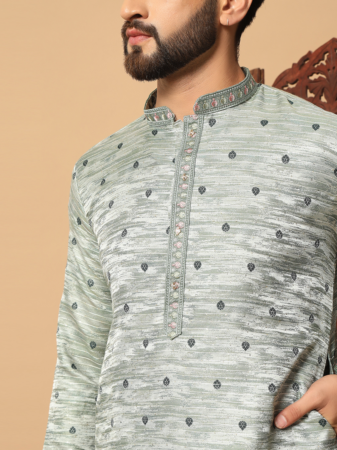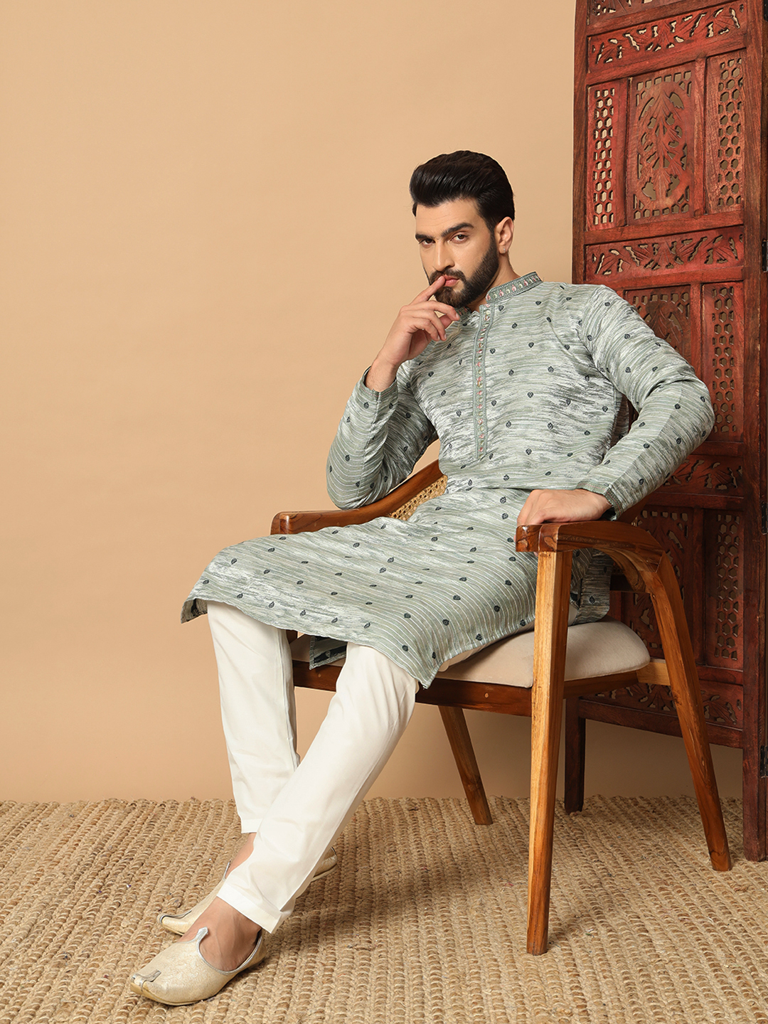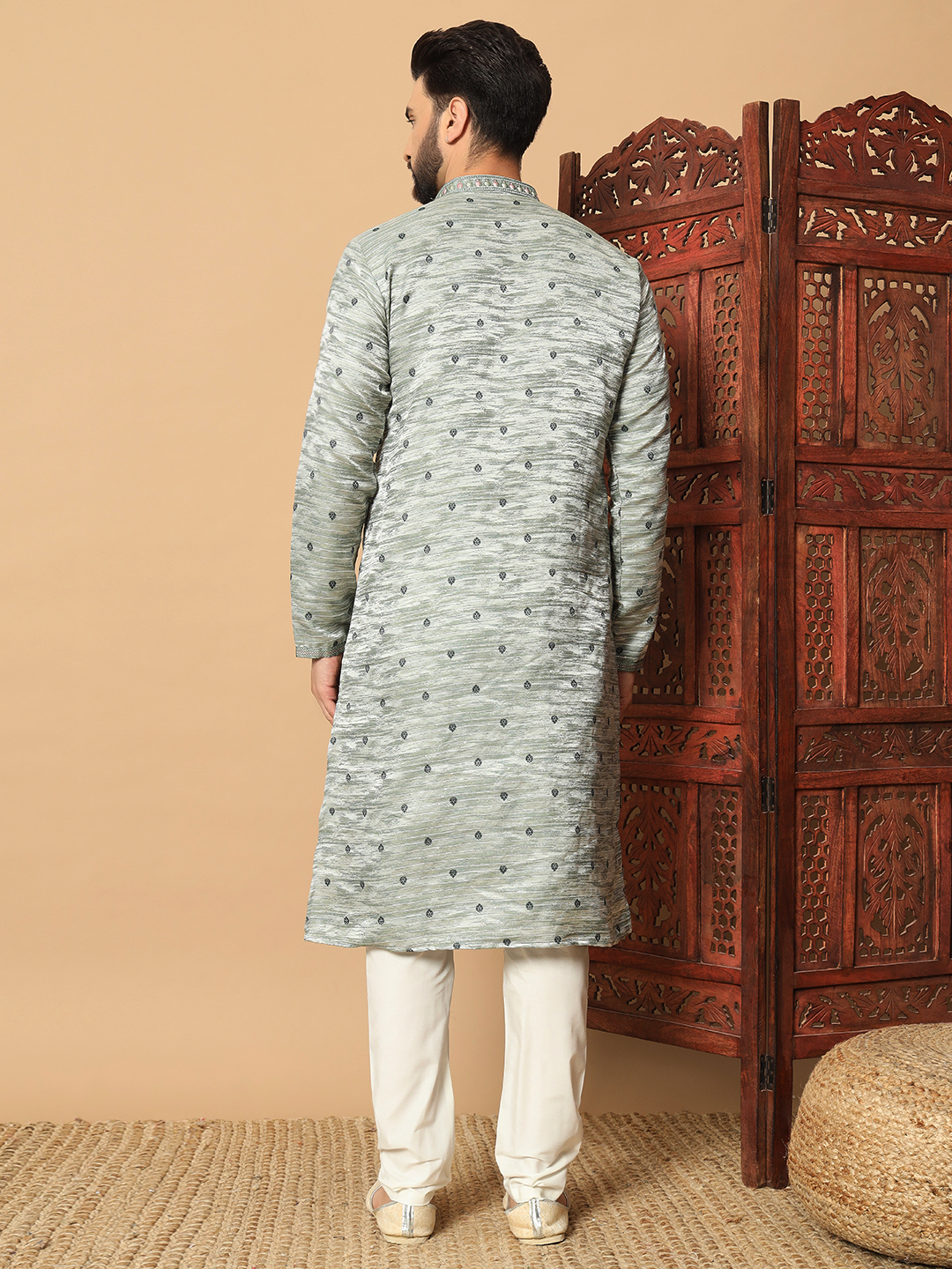 Men’s Ash Green Jacquard Kurta – Premium festive and wedding wear