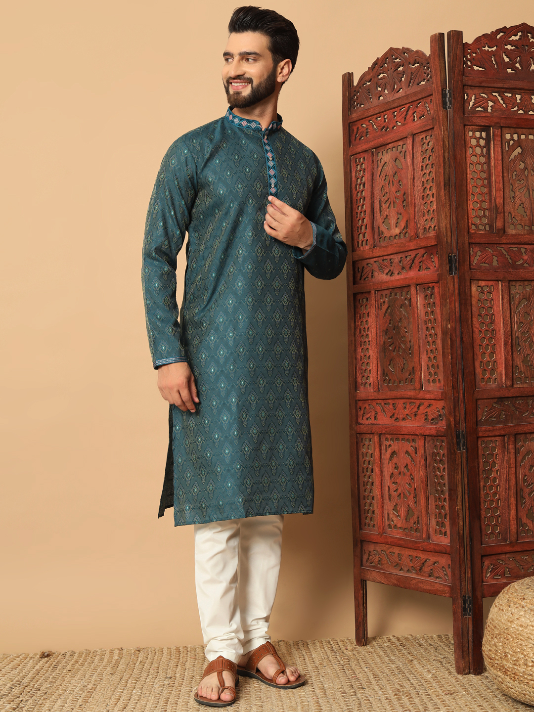 Men’s Deep Teal Green Jacquard Kurta – Premium Ethnic Wear for Festive Elegance