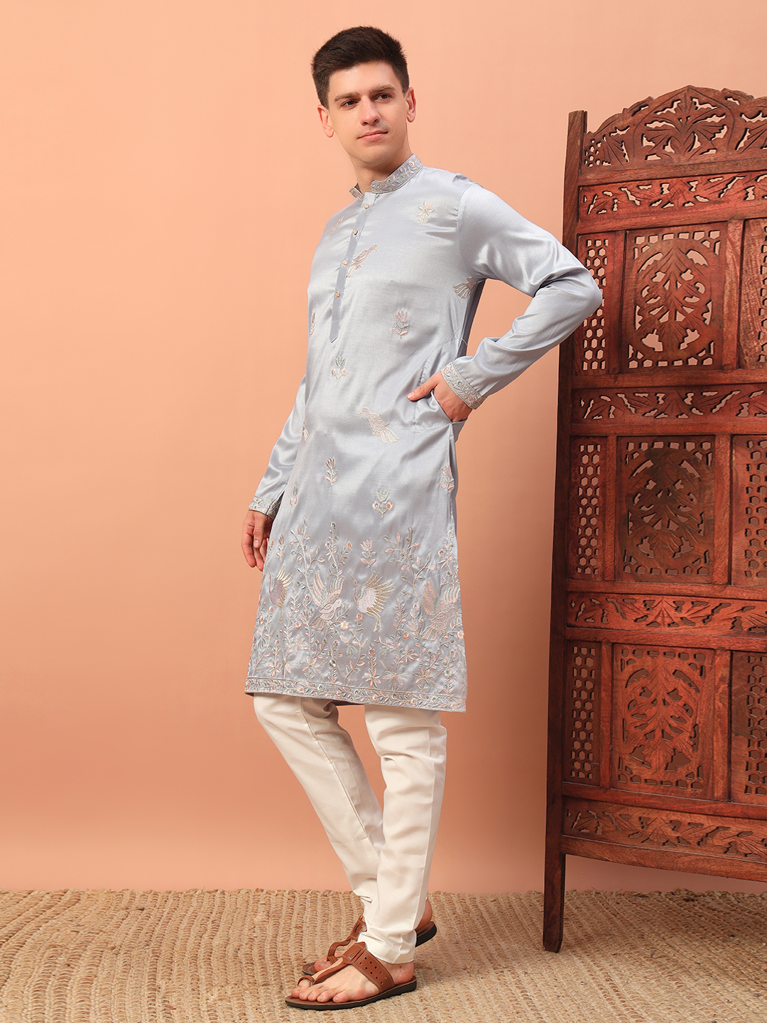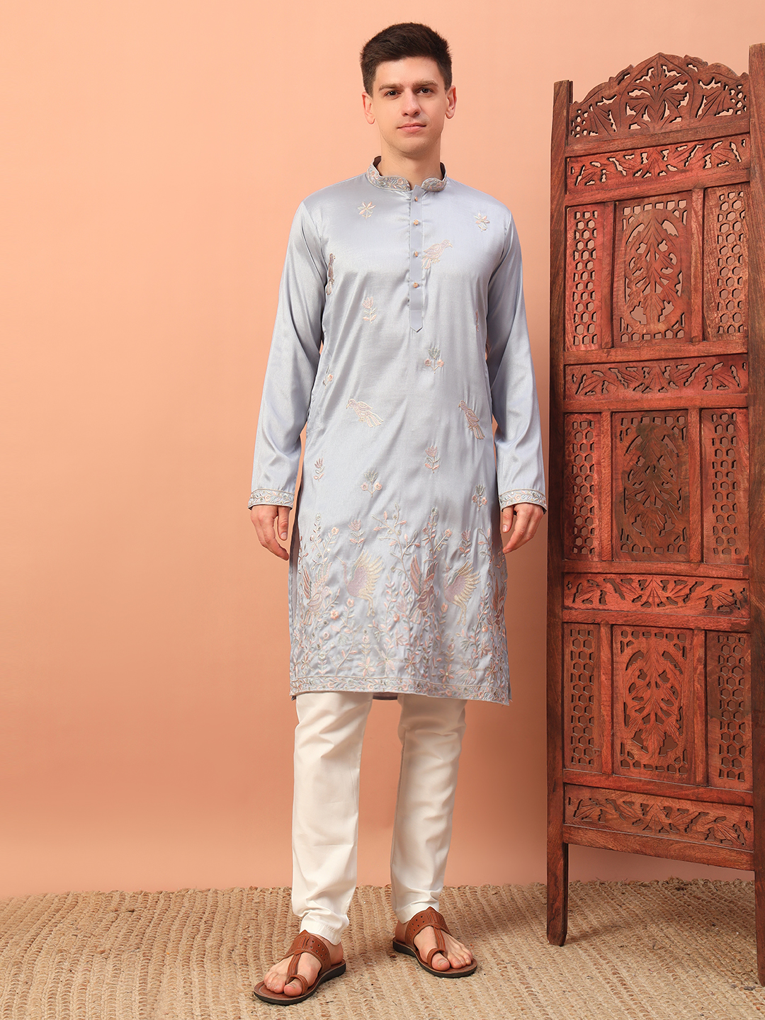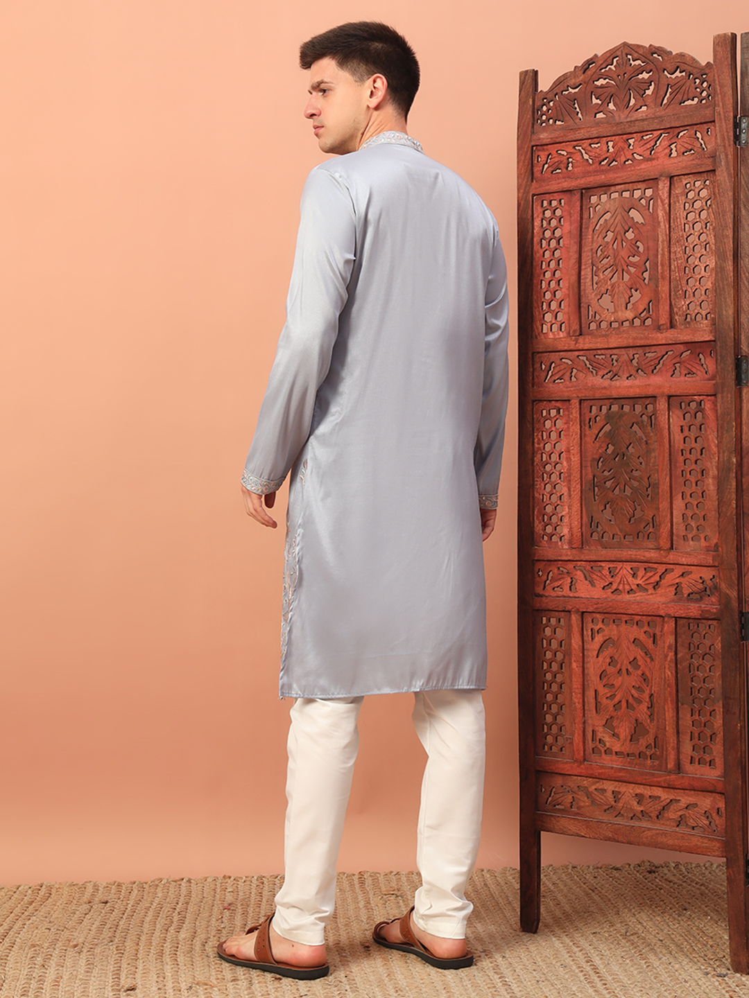 - Light Grey Embroidered Kurta for Men