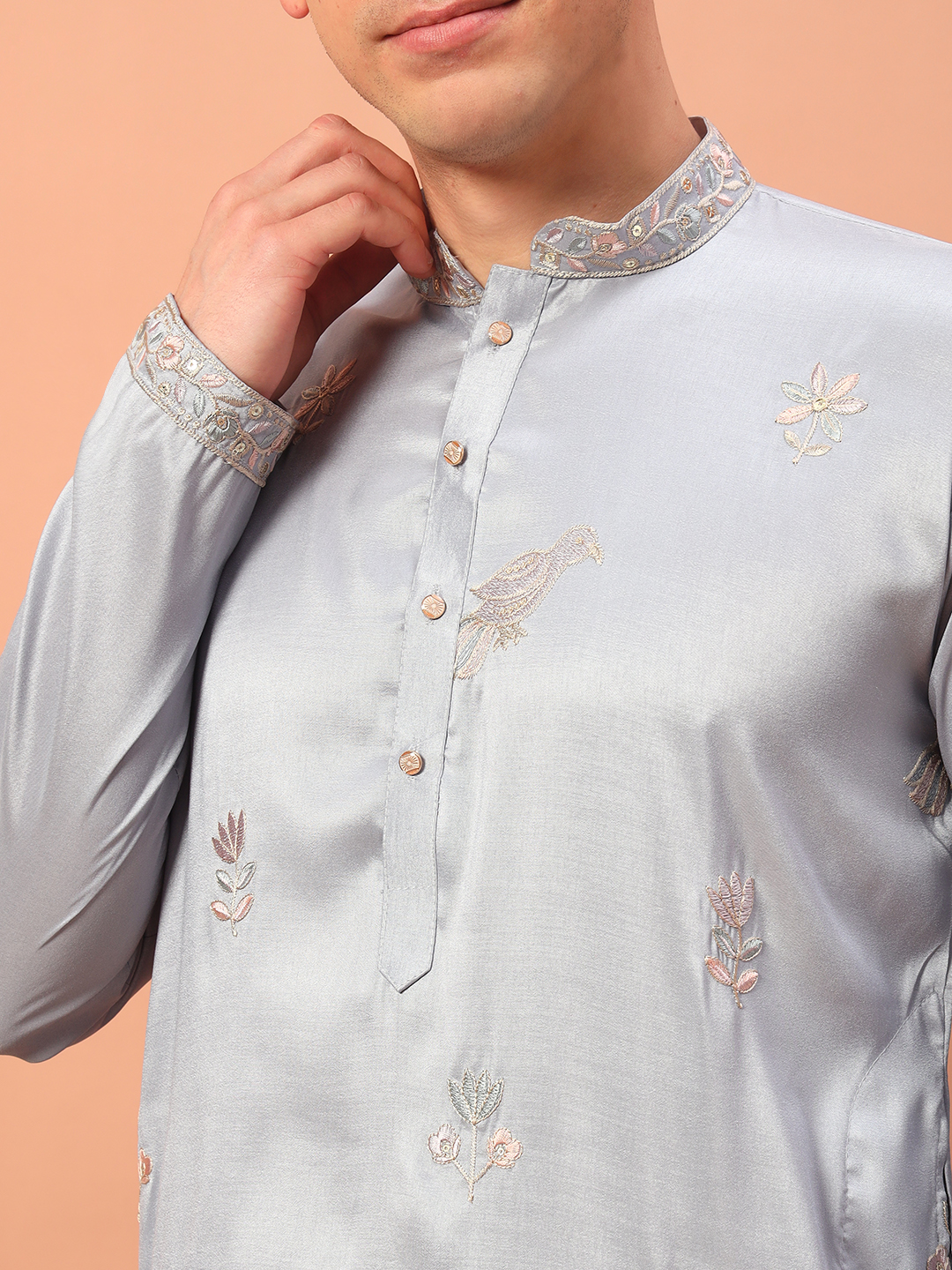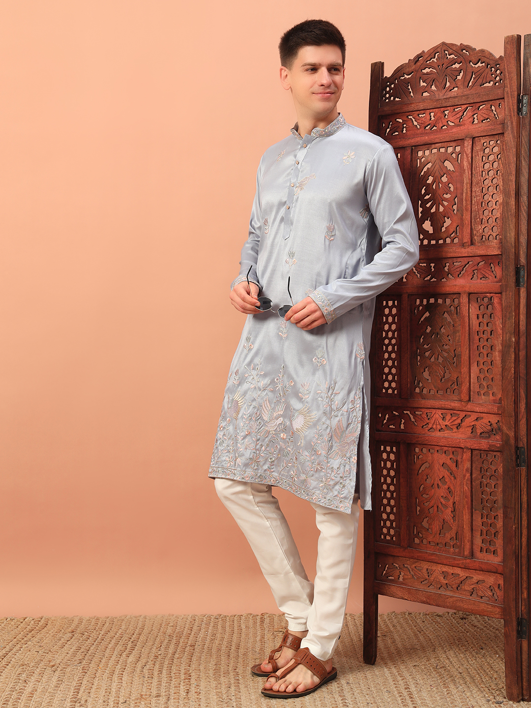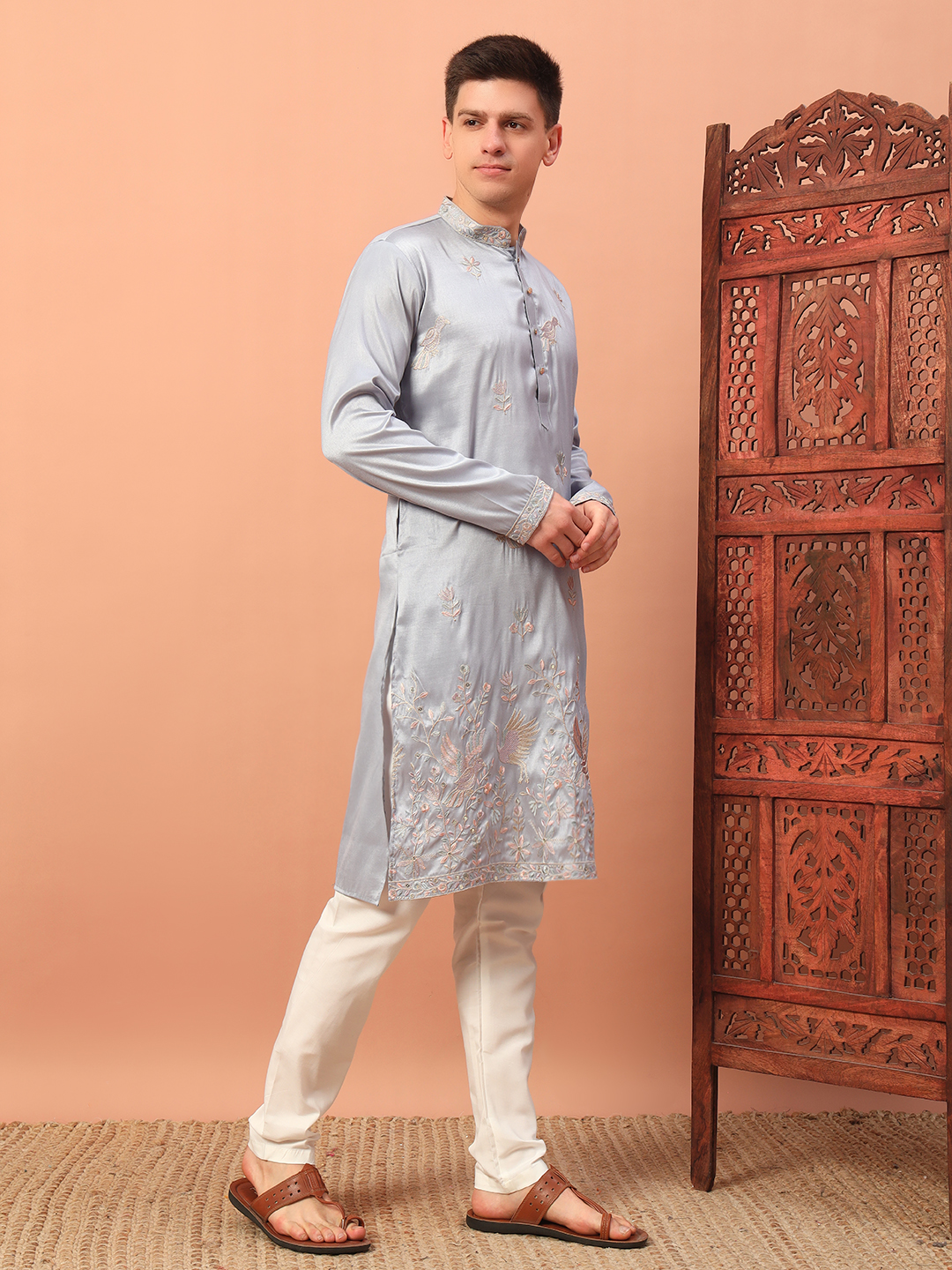 - Light Grey Embroidered Kurta for Men