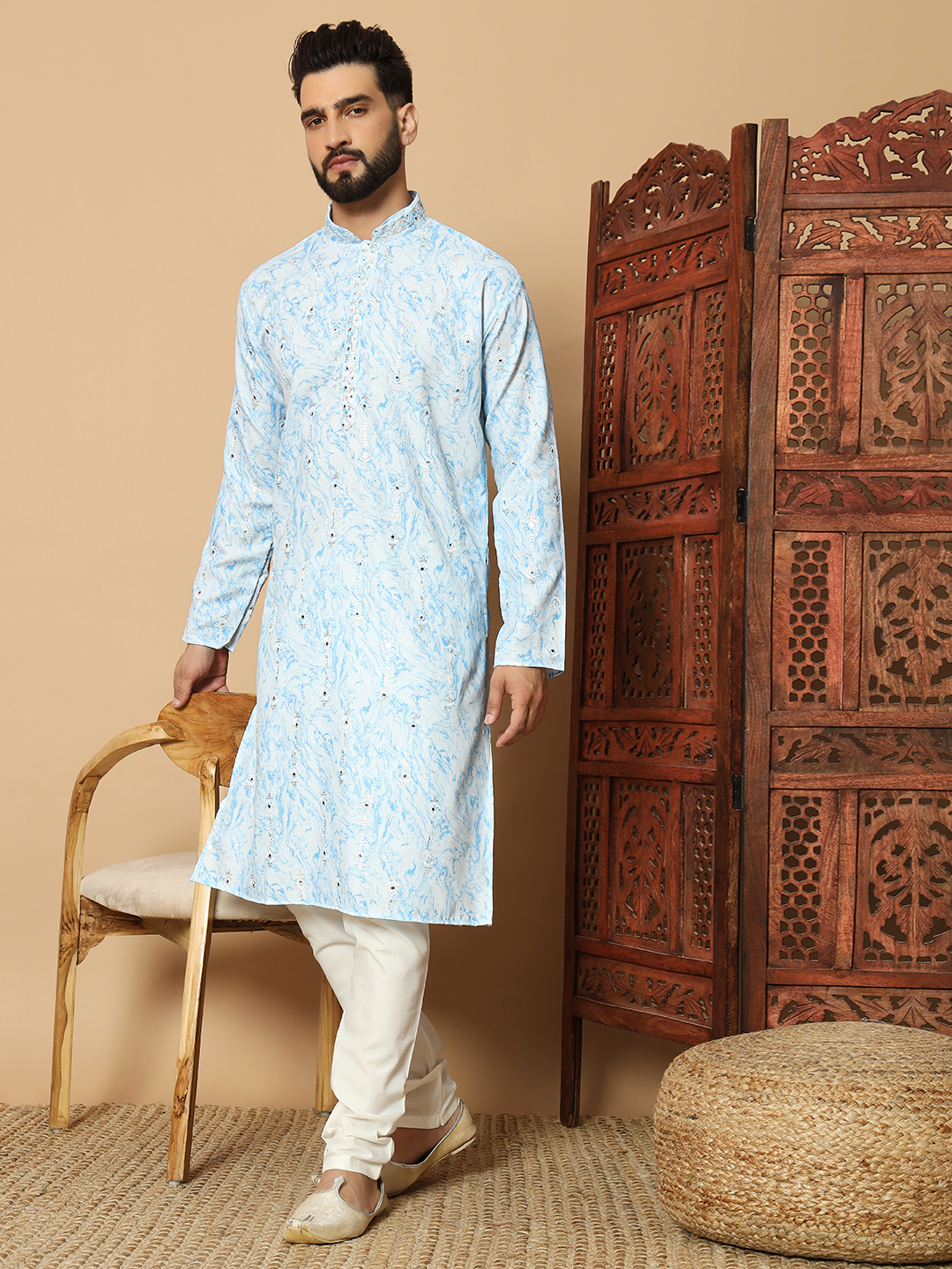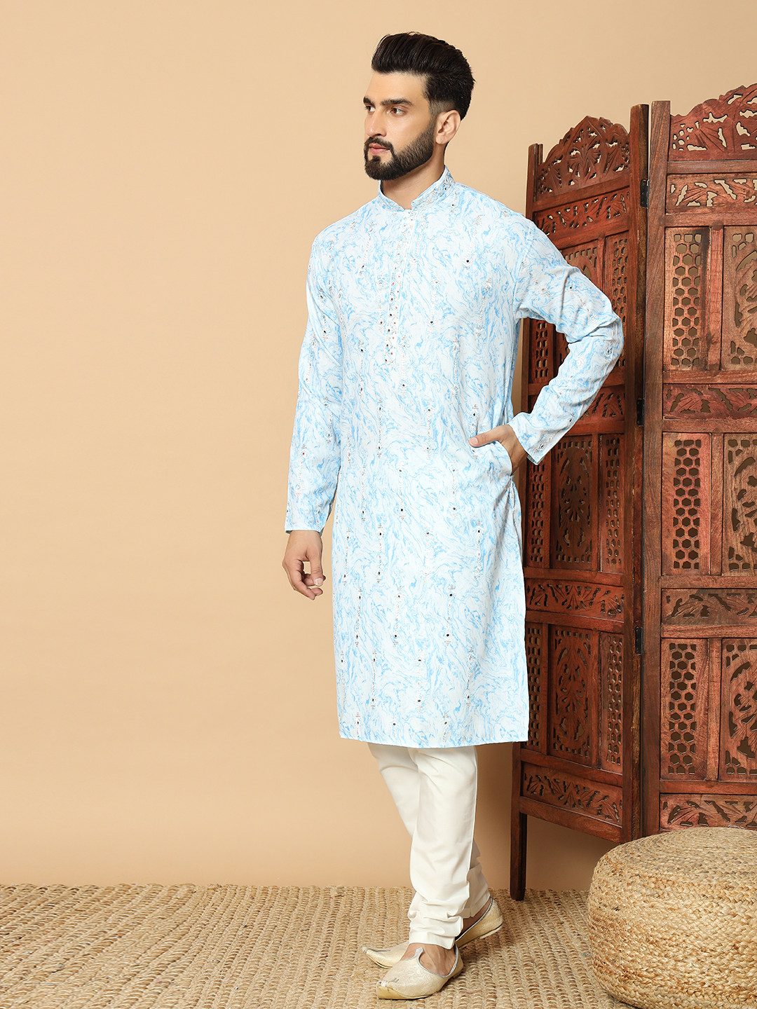 - Powder Blue Marble Printed Kurta for Men